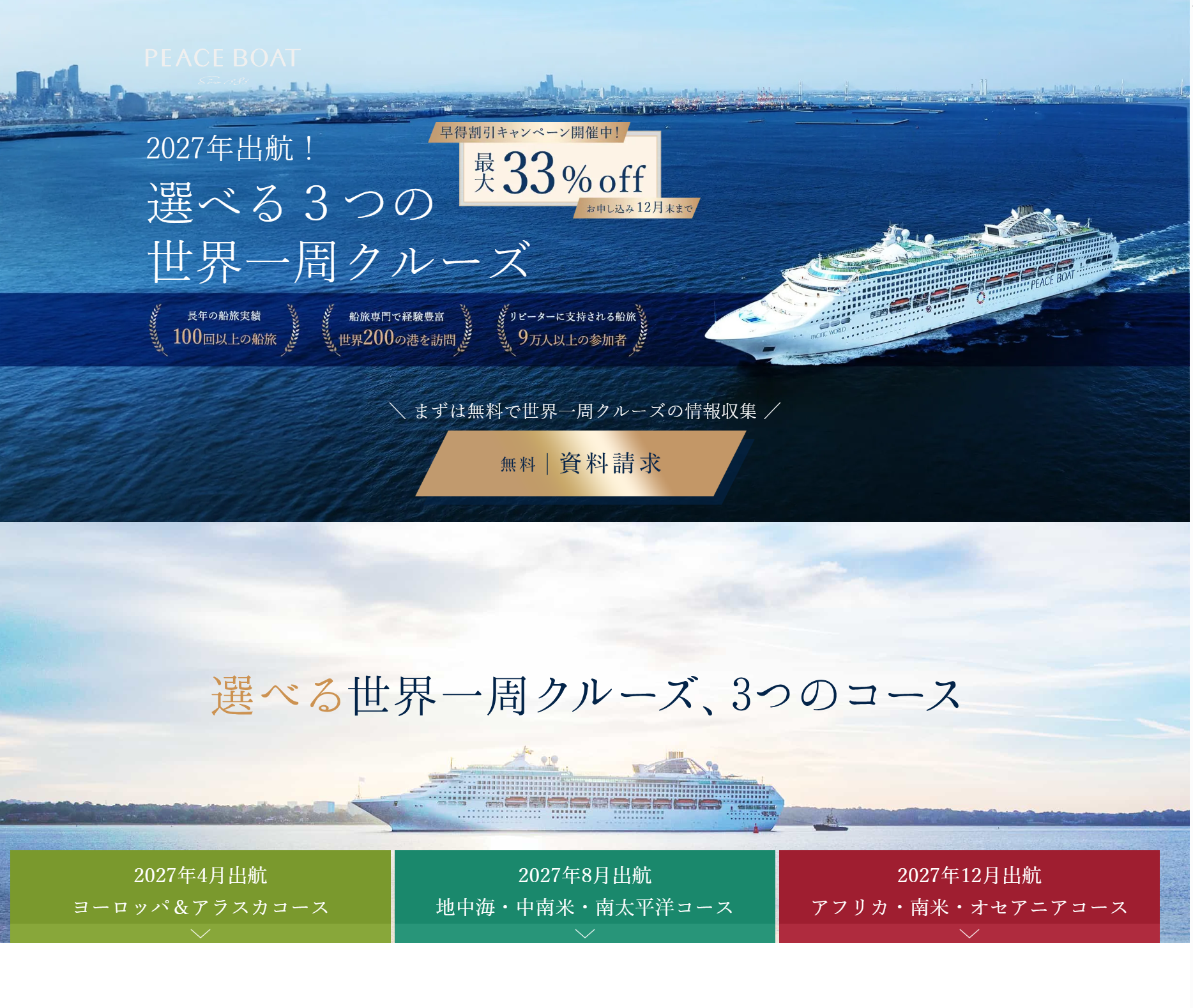(株)ジャパングレイスが運営する「ピースボート地球一周クルーズ」です。